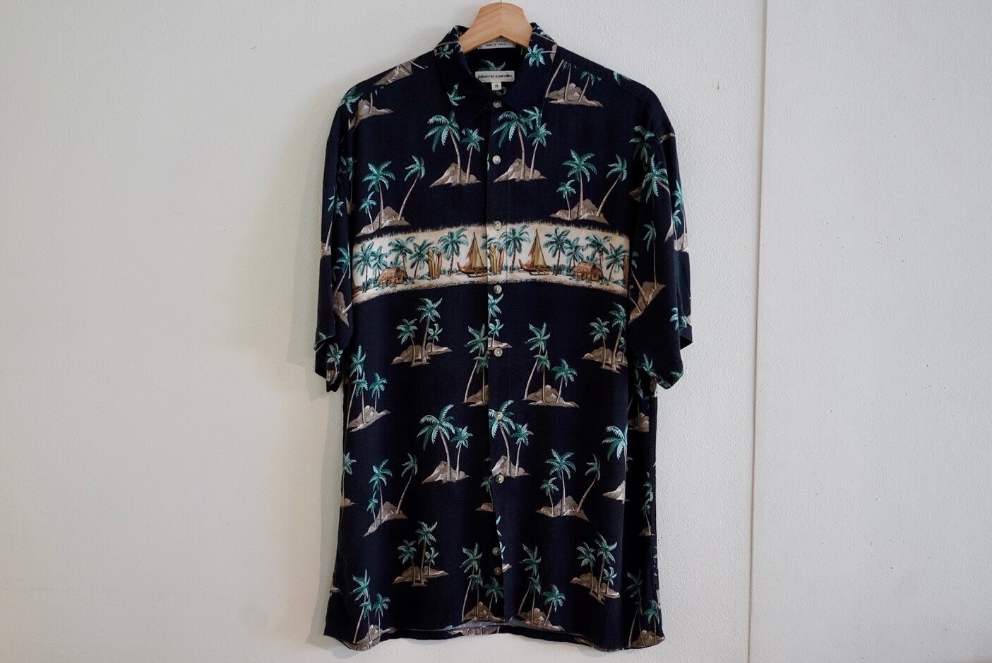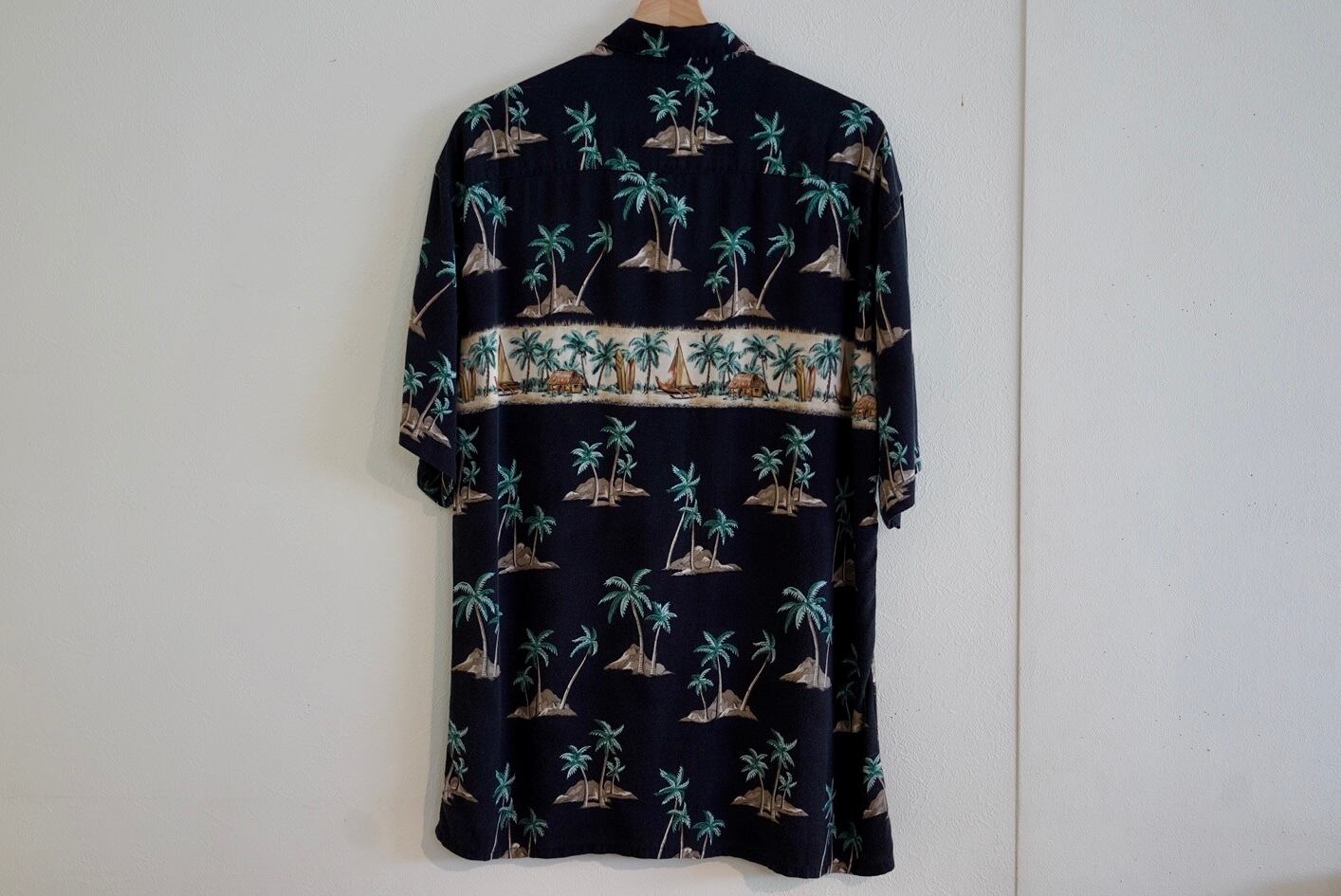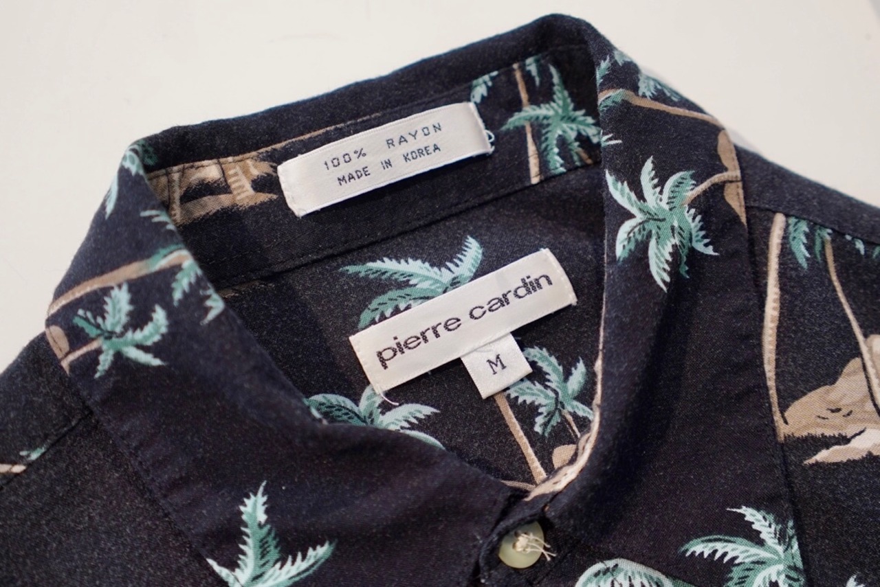 1990年代韓国製の半袖Tシャツです。椰子の木模様の総柄をメインに、胸のラインがアクセントとなっております。